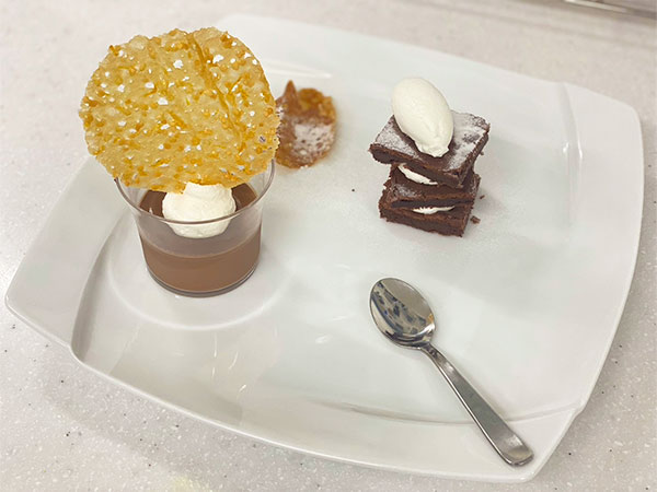 ヴァローナ社のチョコレートを使用したビスキュイや、オレンジを使ったチュイールを皿盛りし、味の構成や香りの組み立てについて学びました📝